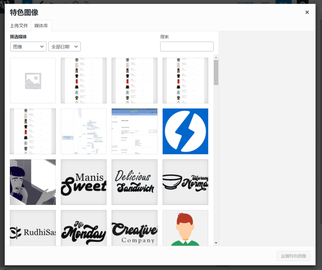 在这里,您可以从计算机上传图像,也可以使用媒体库中的现有图像。选择图像后,点击右下角的“设置特色图像”按钮。
