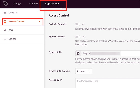 对于高级访问规则,请单击“Access Control”菜单以选择在Coming Soon模式时谁可以访问您的网站。