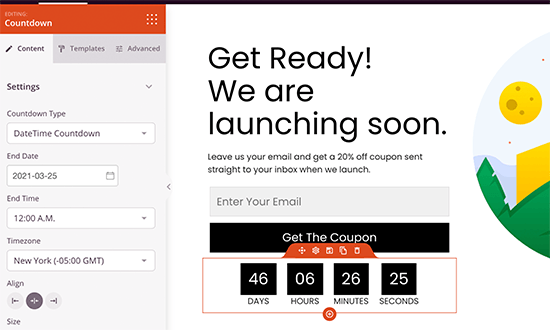 您也可以从左列向页面添加新模块。比如添加一个倒数计时器,告诉用户何时正式上线网站或者活动。