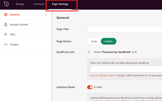 这将启动页面构建器界面,您需要在其中切换到“Page Settings”选项卡。在常规设置下,您可以为页面设置标题,选择isolation模式或以新模板更改页面模板。