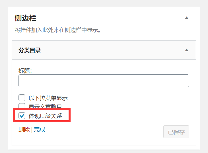 如果需要,可以对其进行更改以在其父级分类目录下显示子分类。只需在窗口小工具中选中“体现层级关系”框即可,如下所示。