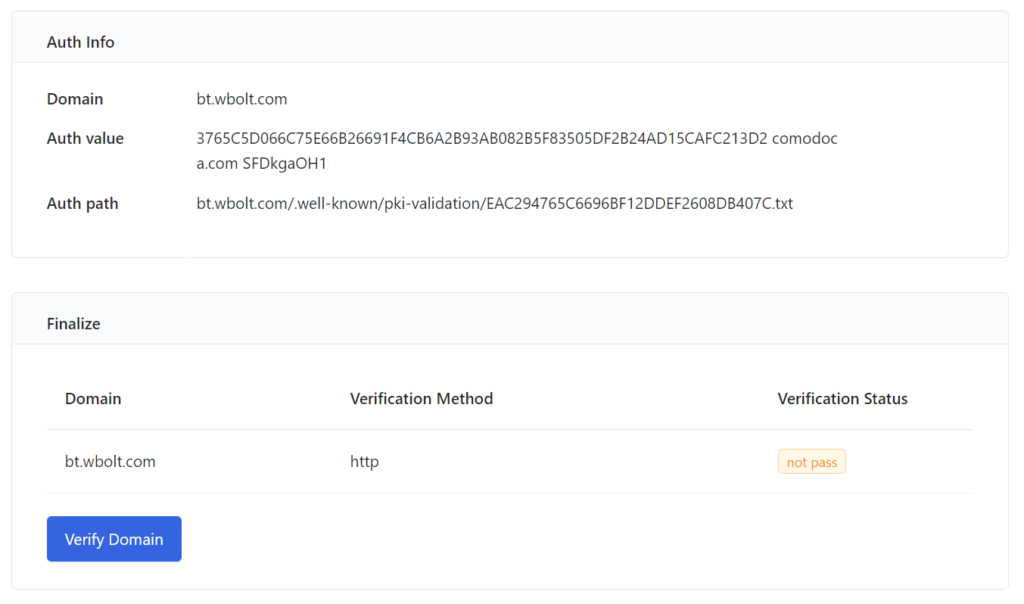 注:验证域名的时候,如失败,检查下Auth Path的URL是否能够正常访问。必须支持http访问才可以成功验证,如果启用了强制https,应临时取消。