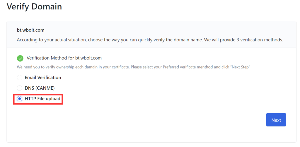 在下个页面,Free SSL还需要对域名进行验证,可以使用邮箱认证、DNS认证和上传文件认证,这里选择最为便捷的文件上传认证作为演示。
