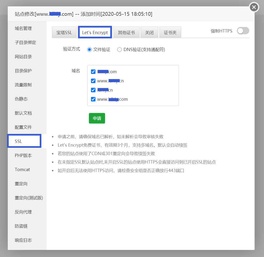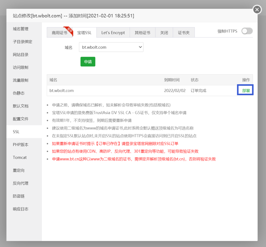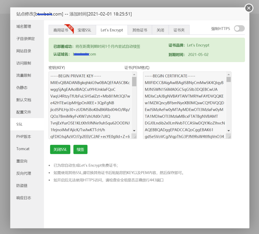 完成宝塔控制面板的SSL申请及部署后,建议启用强制HTTPS,以保证所有域名访问通过https。