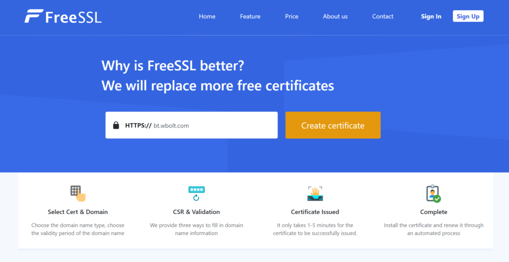 你可以通过Free SSL申请注册免费SSL证书。首先你得注册一个Free SSL的账号,然后登录Free SSL网站。在首页,输入你要申请免费SSL证书的域名,点击Create certificate:
