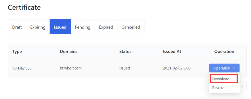 验证成功后,点击Certificate列表对应域名右侧的操作项“Operation”下的“Download”,将会下载一个zip压缩包(包括一个key文件合一个pem文件)。