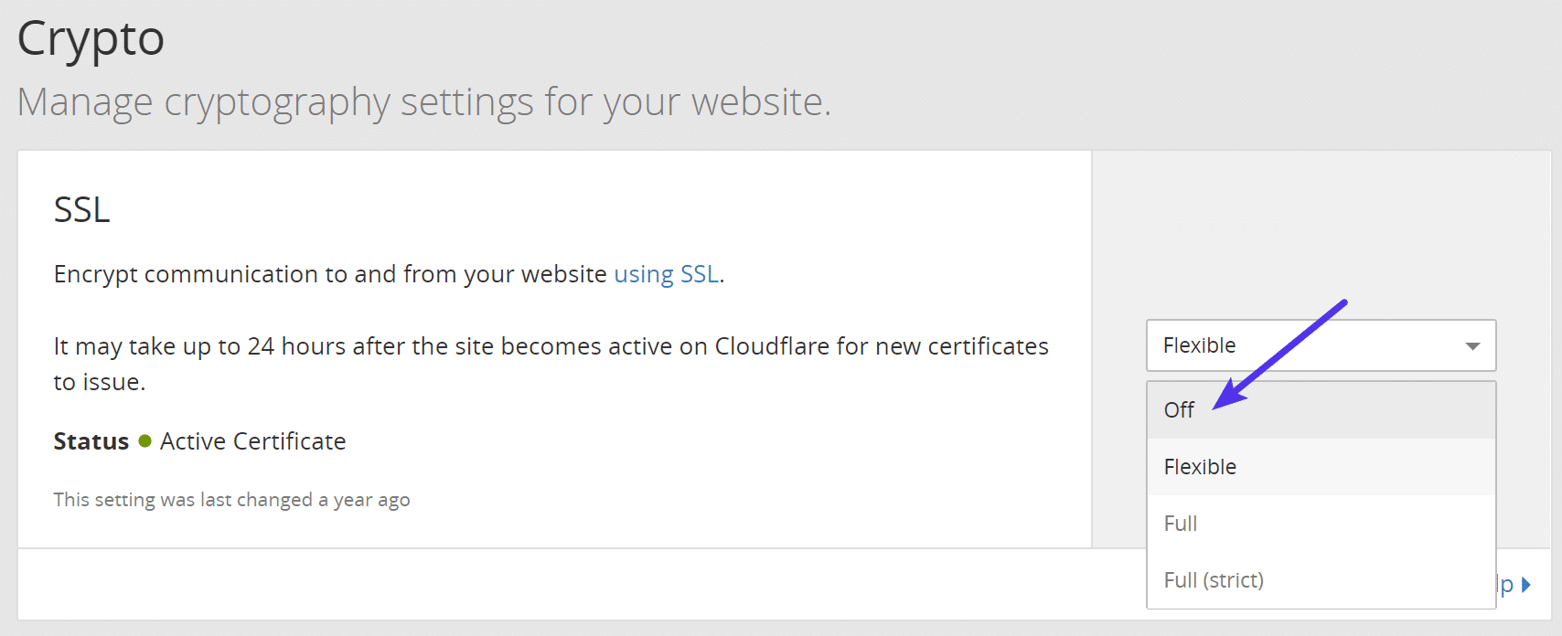 第1步:在Cloudflare中,切换至“Crypto”选项卡,然后关闭SSL(也建议将Cloudflare设置为development mode(开发模式),直到网站服务器的SSL准备就绪为止。您可以通过overview面板上的快速操作来执行此操作。)