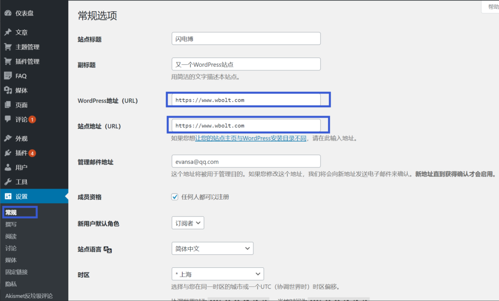 务必在WordPress仪表盘-设置,将WordPress地址和站点地址的URL改为https协议的URL地址,如下图所示: