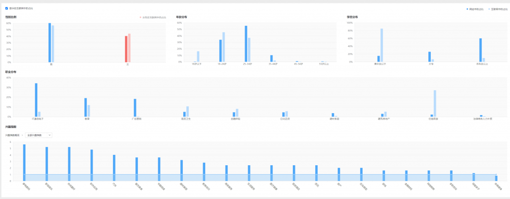 你还可以通过安装百度统计等网站统计代码来深入了解网站受众群体的特性,包括:性别比例、年龄分布、学历分布、职业分布、兴趣分布等,如下图所示: