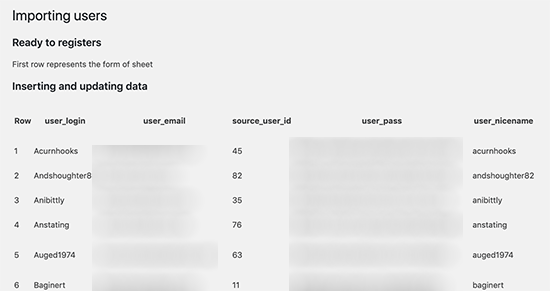 该插件即开始导入WordPress用户,并会在下方显示详细的导入用户列表。