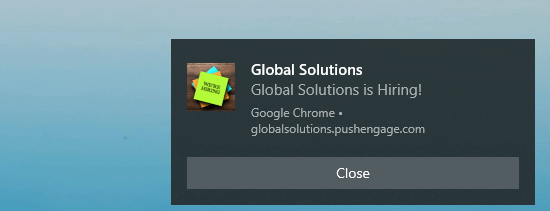 推送通知一般显示在桌面顶部或移动设备的通知区域中,即使用户未在浏览器打开网站,也可以显示。下面是一个在Windows 10系统的推送通知的示例: