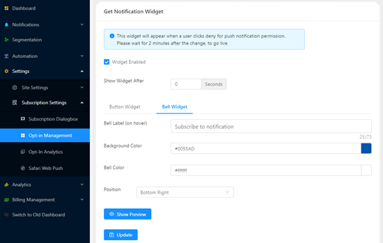 网站用户只需点击此按钮即可订阅您的网站。要更改铃铛通知小部件相关设置,只需在PushEngage帐户中转到“Settings » Subscription Settings » Opt-in Management”,即可更改小部件的颜色,位置和标签: