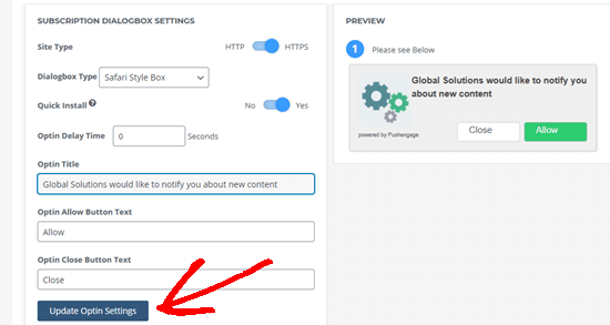 在该设置标签页,可选择网站协议、对话框风格、快速安装、处理时间、消息标题、按钮文字等,完成设置更好务必点击“Update Optin Settings”按钮以保存更改。