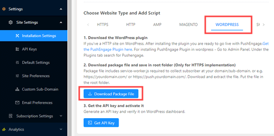 您可以通过PushEngage帐户中的“Settings » Site Settings » Installation Settings ”页面,在“Choose Website Type and Add Script”版块切换到WordPress选项卡。