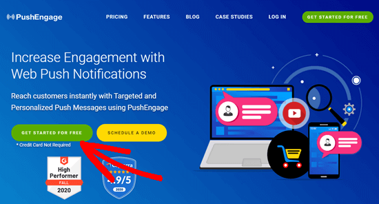 首先,您需要访问PushEngage网站并点击“Get Started For Free”按钮: