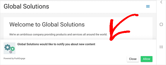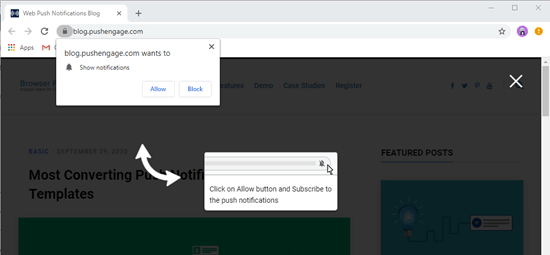 例如,您可以设置一个叠加层,该层用于显示在网站内容的顶部,以方便网站用户点击以允许通知。这是PushEngage网站上的通知操作叠加层示例: