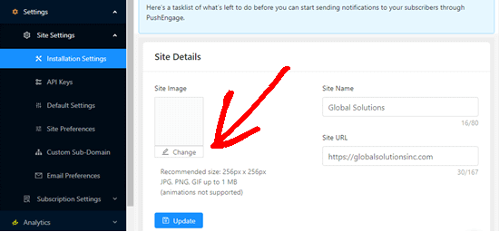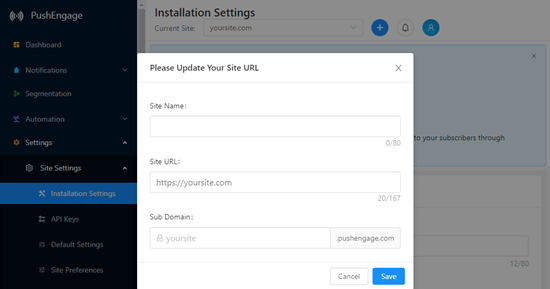 在PushEngage仪表板,你会看到“Settings » Site Settings » Installation Settings”安装设置页面。