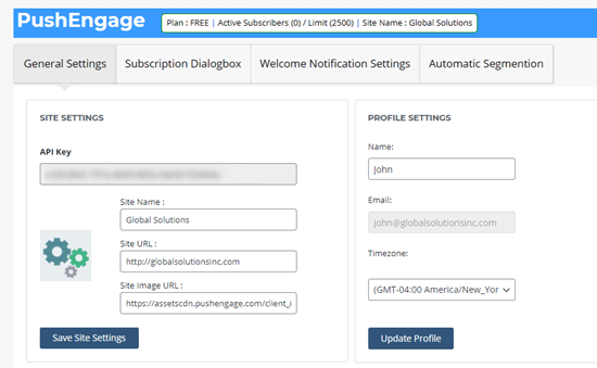完成API密钥提交后,您将会看到更多的PushEngage设置项。General Settings(常规设置)可以更改在PushEngage网站上设置的帐户详细信息: