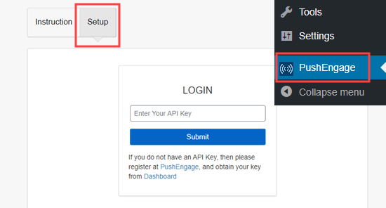 在WordPress后台进入PushEngage插件设置页面,点击“Setup”标签,在API密钥输入框填入刚才获取到的API密钥,最后点击Submit按钮提交即可。