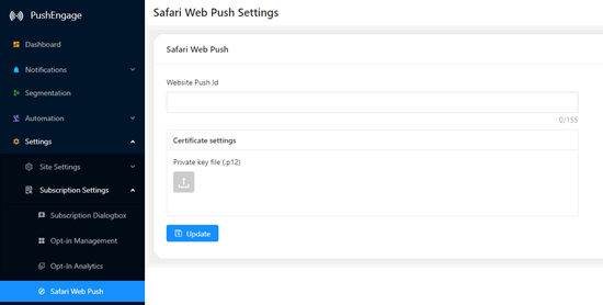 获得推送ID并创建证书后,在PushEngage网站帐户的Settings » Subscription Settings » Safari Web Push下添加这些证书: