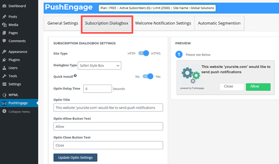 接下来,Subscription Dialogbox(订阅对话框)则用于设置当网站访客打开您的网站时看到的消息。