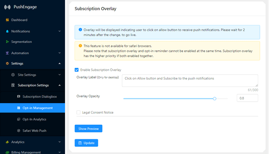 您可以在PushEngage网站帐户中设置叠加层。只需转到Settings » Subscription Settings » Opt-in Management,向下滚动找到“Subscription Overlay”部分。