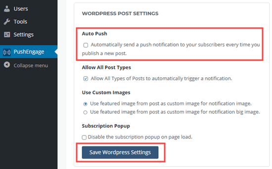 只需向下滚动到“WordPress Post Settings”部分,然后取消选中“Auto Push”框,最后点击“Save WordPress Settings”按钮保存即可。