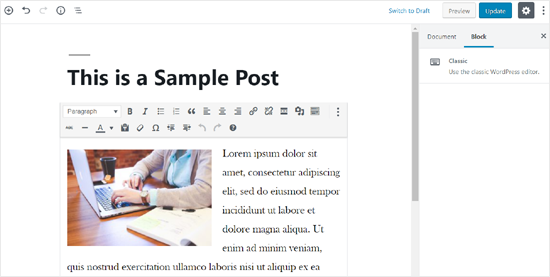在将网站更新为WordPress 5.0之后,您的旧文章内容将被包装在Gutenberg编辑器的Classic块中。