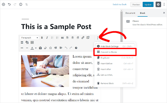 您也可以将旧文章内容转换为Gutenberg块。只需从“经典”区块的下拉菜单中单击“ Convert to Blocks”选项,然后它将自动将文章内容转换为适当的区块。
