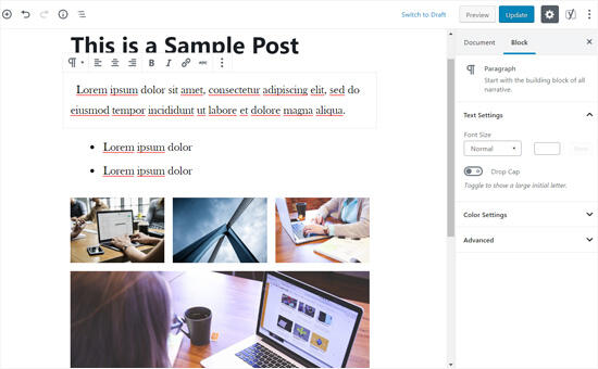 大多数页面构建器是前端编辑器,而Gutenberg是后端编辑器。这是在Gutenberg内容编辑器中编辑内容的方法。