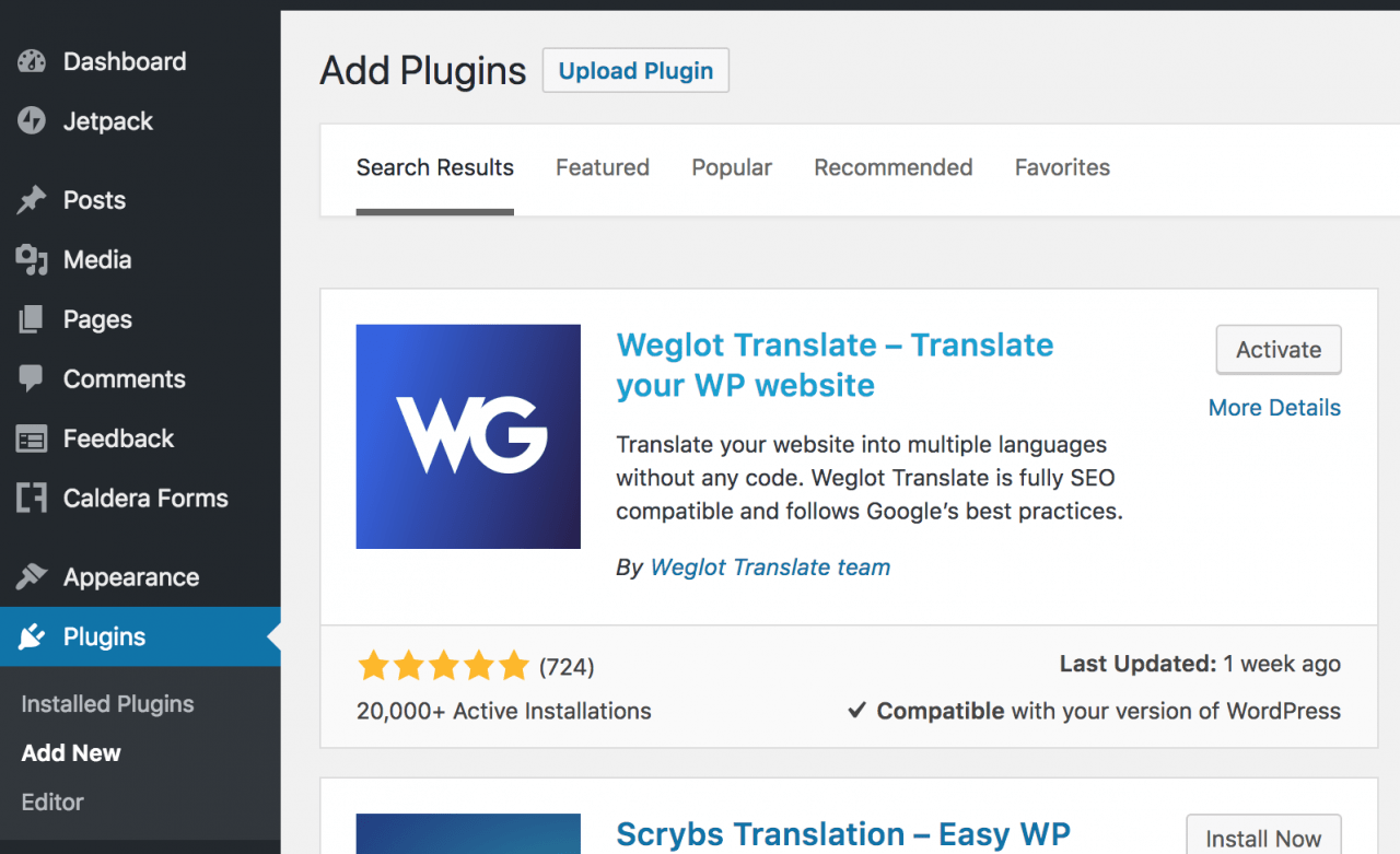 它也是提供免费版本,可从WordPress插件库获得:前往WordPress仪表板,转到插件→安装插件,搜索Weglot,然后安装→激活。