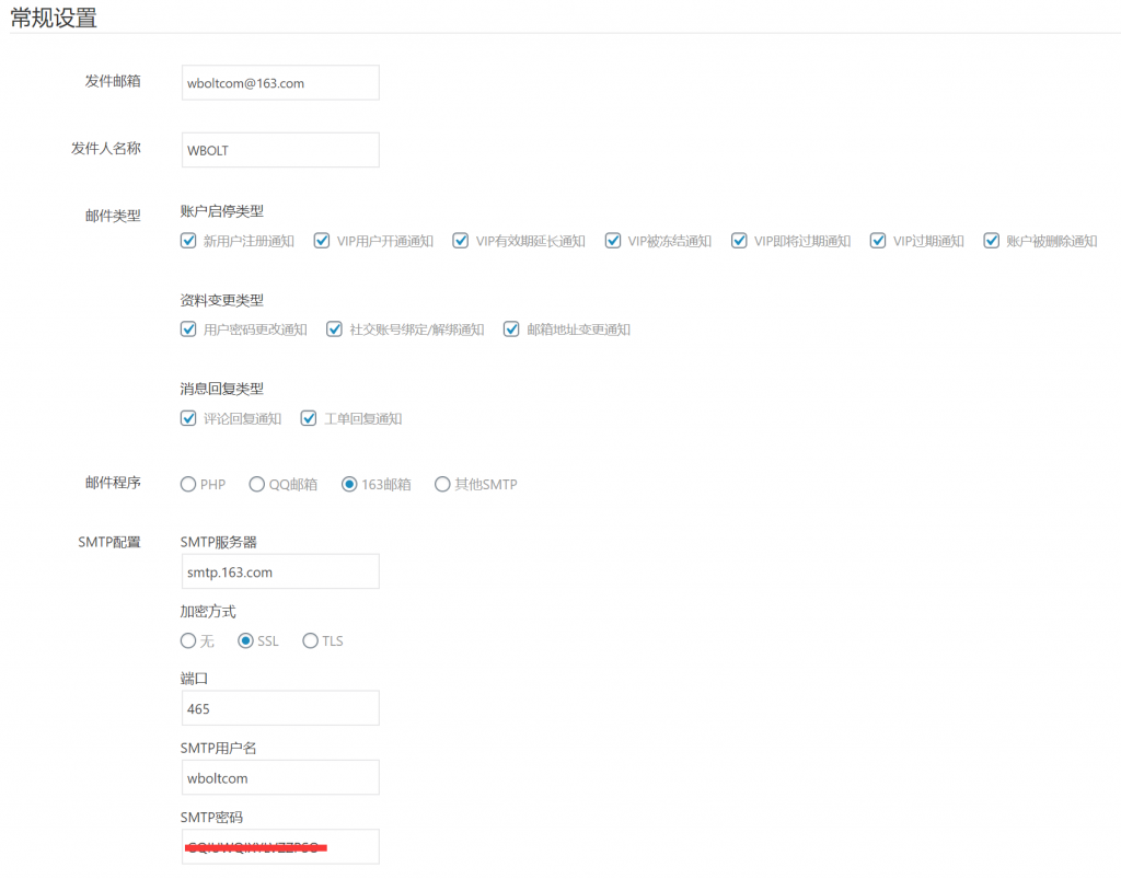 - 发件邮箱-根据自己的需要选择,使用QQ邮箱的SMTP就填写QQ邮箱,使用163则填写163邮箱(如果你网站注册用户大部分使用QQ邮箱,个人建议使用QQ邮箱作为发件邮箱);