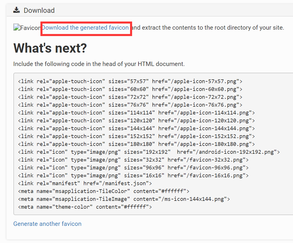 跳转页面后,点击Download the generated favicon,将生成的各种规格的favicon的压缩包下载至本地。