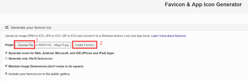 访问favicon在线生成工具网站favicon-generator.org,点击Choose File上传你提前准备的正方形Logo,然后点击Create Favicon;