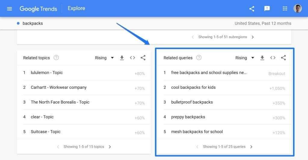只需在 Google Trends 中输入一个短语,就能看到与之相关的其他搜索词。例如,如果您输入 “backpacks”,您会看到 “cool backpacks for kids” 和 “carhartt backpack” 等结果。