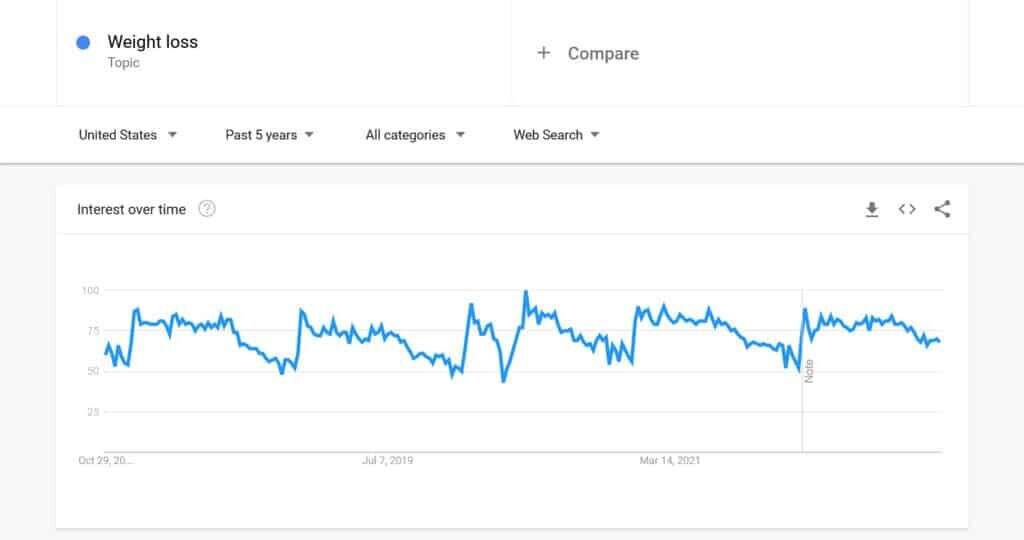 然后,利用 Google Trends 的数据确定这些词最流行的时间,并据此计划内容。这将有助于确保您在这些词最流行的时候发表文章。例如,您可以看到 “weight loss” 的关注度在新年前后达到高峰(所有的减肥计划都开始执行了),然后在夏季来临前不久再次达到高峰。