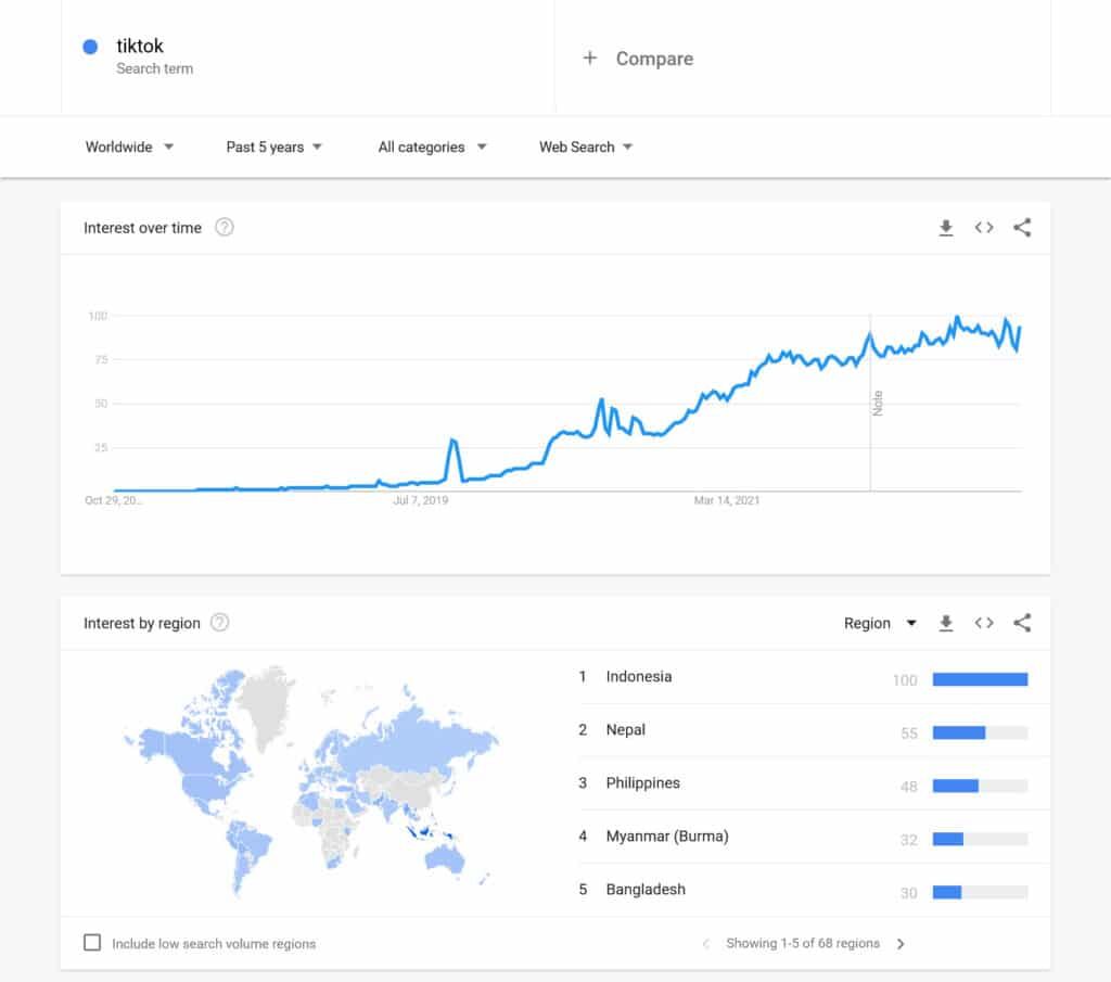 首先,只需在 Google Trends 搜索栏中输入当前流行趋势的名称。然后,您就可以看到该趋势的流行程度,以及它在哪些地方引起了最大的反响。