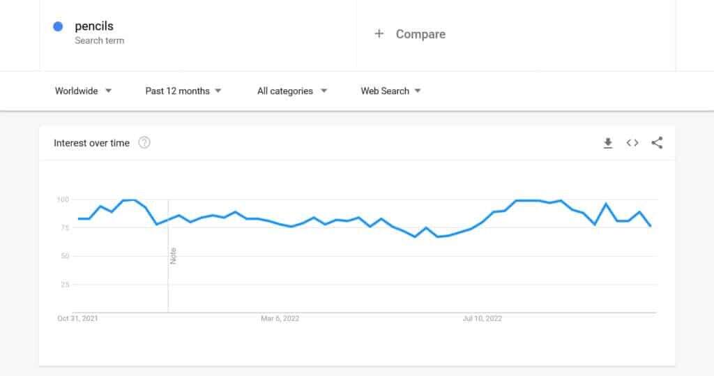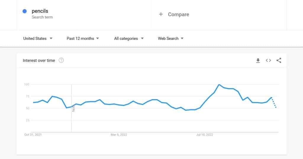 例如,当搜索 “pencils” 时,在美国,人们的兴趣会在 7 月至 9 月的返校购物季期间增加,然后在一年的其余时间里逐渐减弱。