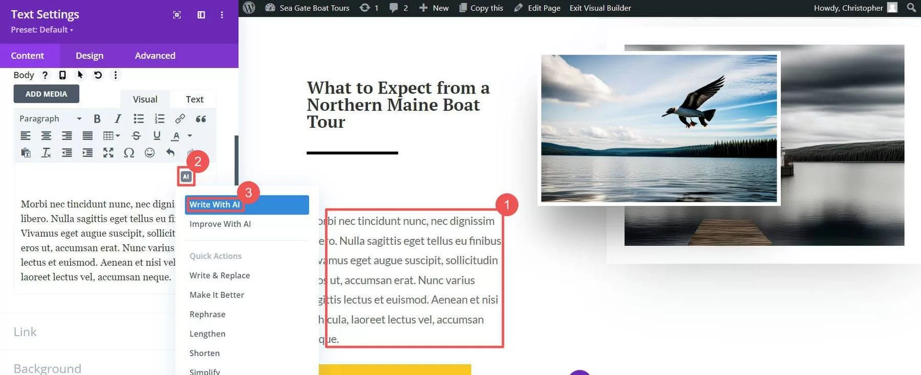 现在我们已经为页面创建了一张新图片,接下来就可以生成网站文案了。布局中有一些占位符文本,我们想用 Divi AI 将其替换掉。为此,请打开文本模块,点击 “AI” 图标,然后选择 “Write With AI“。