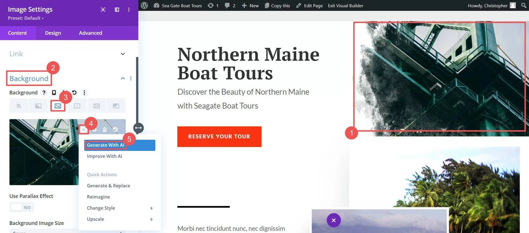 我们要更改 Hero 部分(以及布局中其他部分)的图片。要使用 Divi AI 生成图片,请打开图片模块,转到背景图片,选择 “AI” 图标,然后选择 “Generate With AI“。