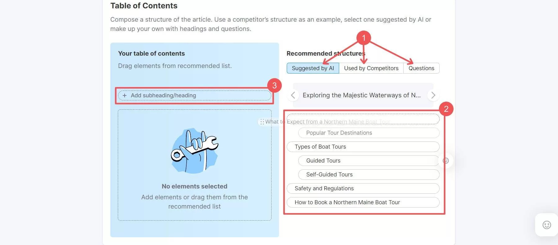 最后一个主要步骤是构建页面大纲。本部分根据您的主题列出了人工智能建议的标题和竞争对手的标题/问题。将您想要的内容拖到大纲中。您甚至可以使用左侧的 “+ Add subheading/heading” 按钮添加自己的副标题/标题。无论是登陆页面还是博客文章,该目录部分都是构建页面结构的绝佳工具。