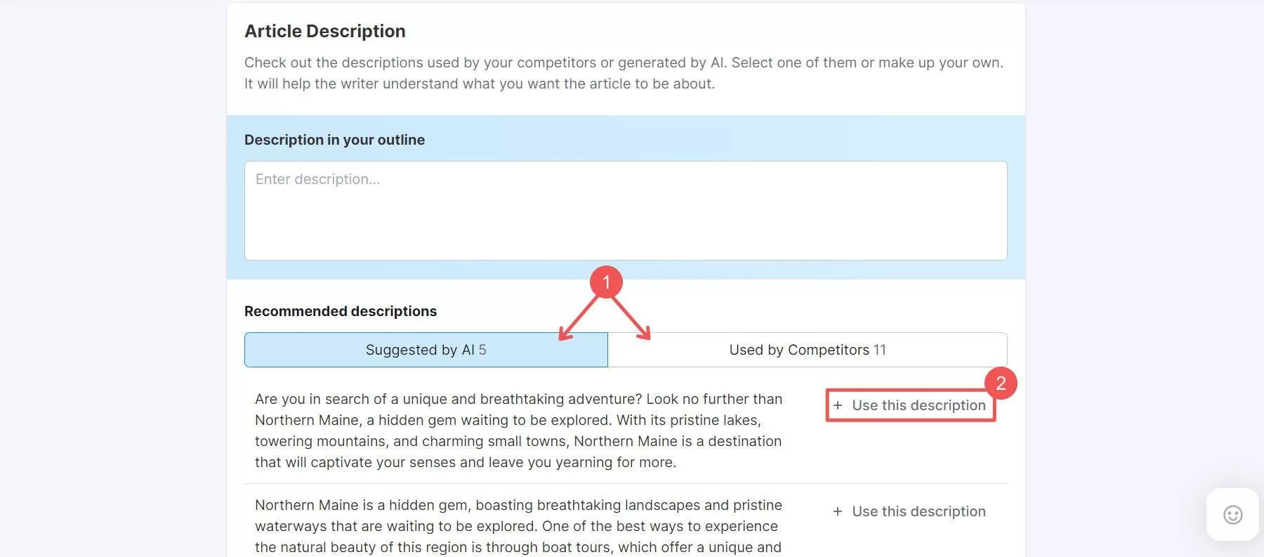 接下来,文章描述的选项与标题的选项相同:自己撰写、从竞争对手处汲取灵感或采纳人工智能的建议。您可以从人工智能建议的描述开始,然后根据您的设想进行修改。