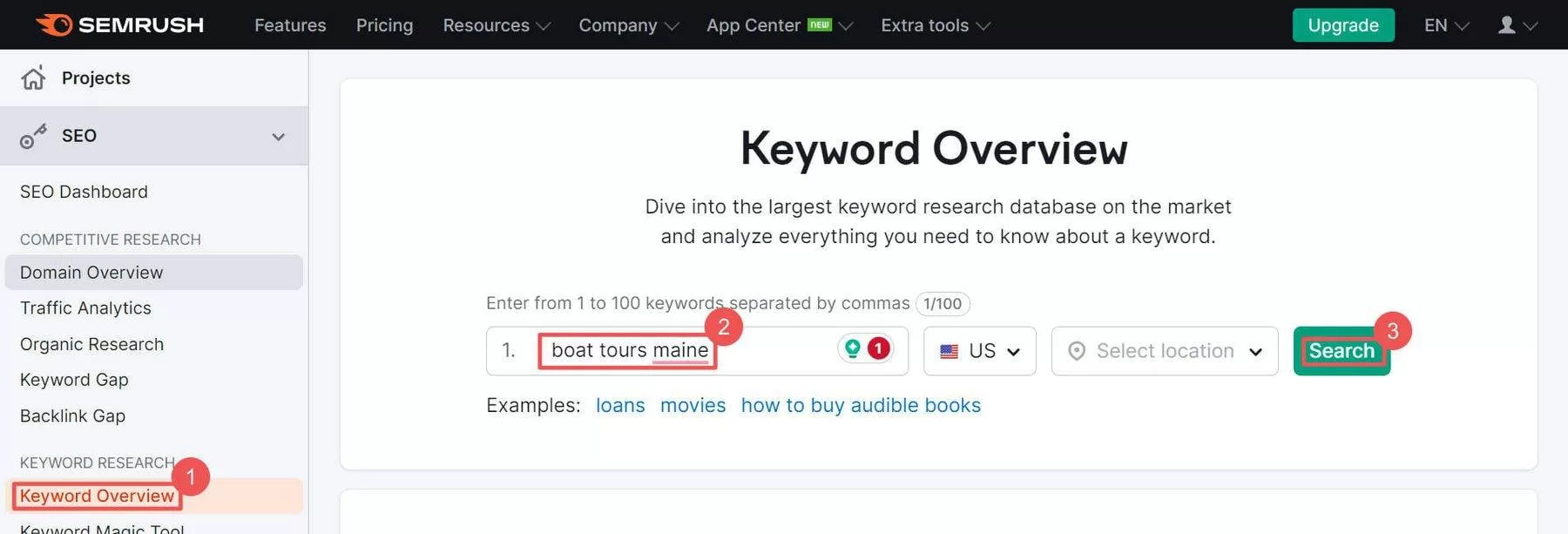 在搜索栏中输入要分析的关键词,开始关键词研究。选择要关注的目标区域。点击 “Search“,Semrush将带您进入该关键词的 “Keyword Overview” 页面。