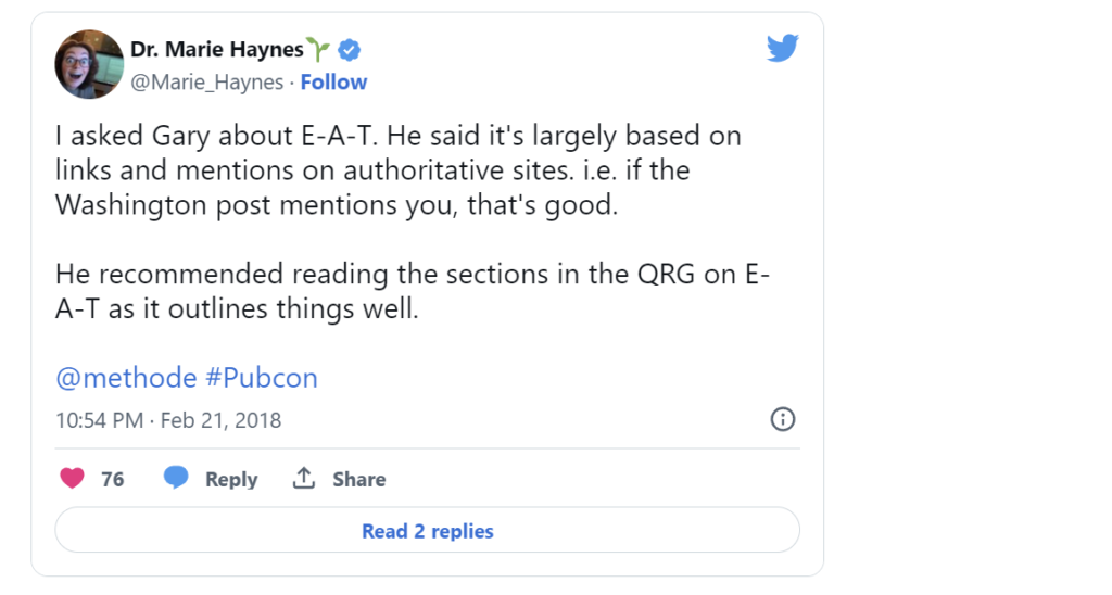 尽管在谷歌的搜索质量评级指南中没有提到链接,但谷歌网站管理员趋势分析师Gary Illyes曾说,E-A-T主要是基于权威网站的链接和提及。