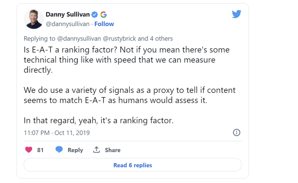缺乏E-A-T被认为是许多YMYL网站在2018年8月谷歌推出现在臭名昭著的 “医疗” 更新时像石头一样掉下来的原因。