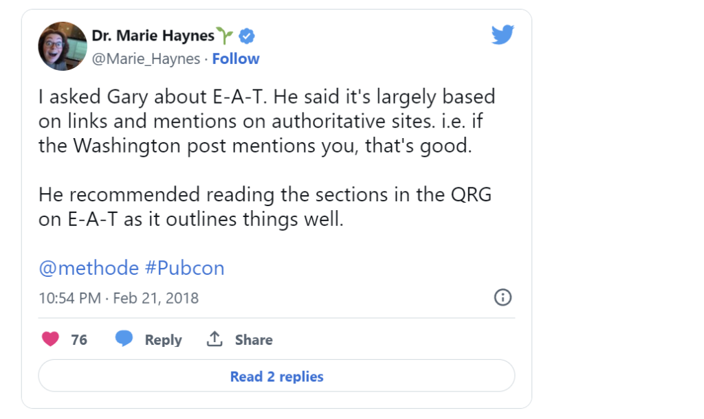 搜索引擎可以推断出该信息的方法之一是通过跟踪网站的链接。毕竟,Gary Illyes证实,链接和提及对于最初的E-A-T概念是实质性的。这可能并没有随着经验的引入而改变。