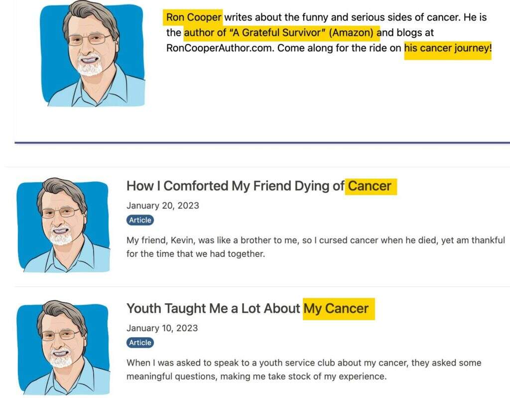 关于帮助应对癌症(YMYL主题)的博文作者的页面。作者的简历显示了对疾病的个人经历的提及。