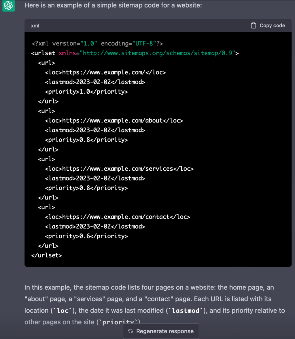 ChatGPT可以利用收集到的信息创建网站地图代码大纲,包括必要的元素,如开头和结尾的XML标签以及网站上的网页URL。
