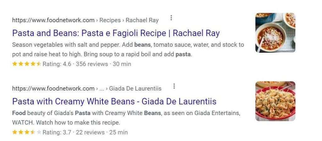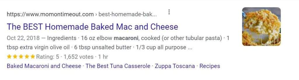 它看起来不错,肯定能得到一些点击。让我们把它与一个使用schema标记的丰富片段搜索结果进行比较,包括评级、加注数和烹饪时间。丰富的结果是可能的,因为有schema标记: