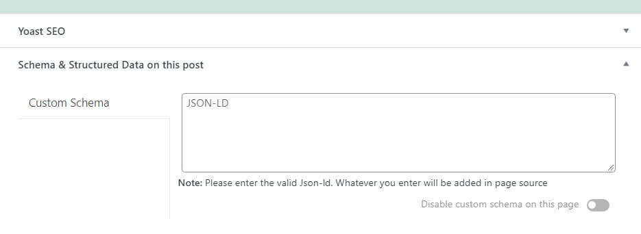 然而,如果你正在编辑一个页面或一个文章,并且你想添加自定义模式,你可以通过进入这个文章的schema和结构化数据小部件,选择Custom Schema选项来实现。